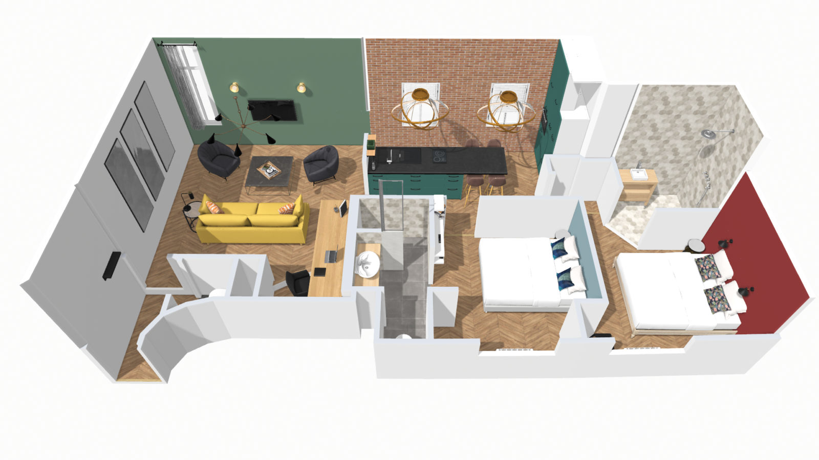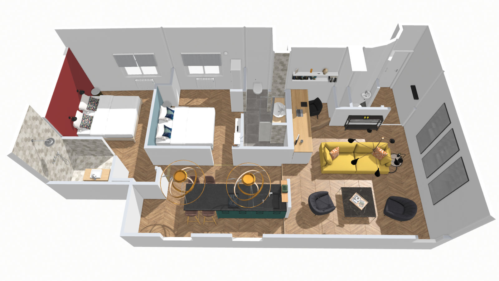 The apartment offers two double bedrooms, each with its own bathroom: one with toilet, the other without.