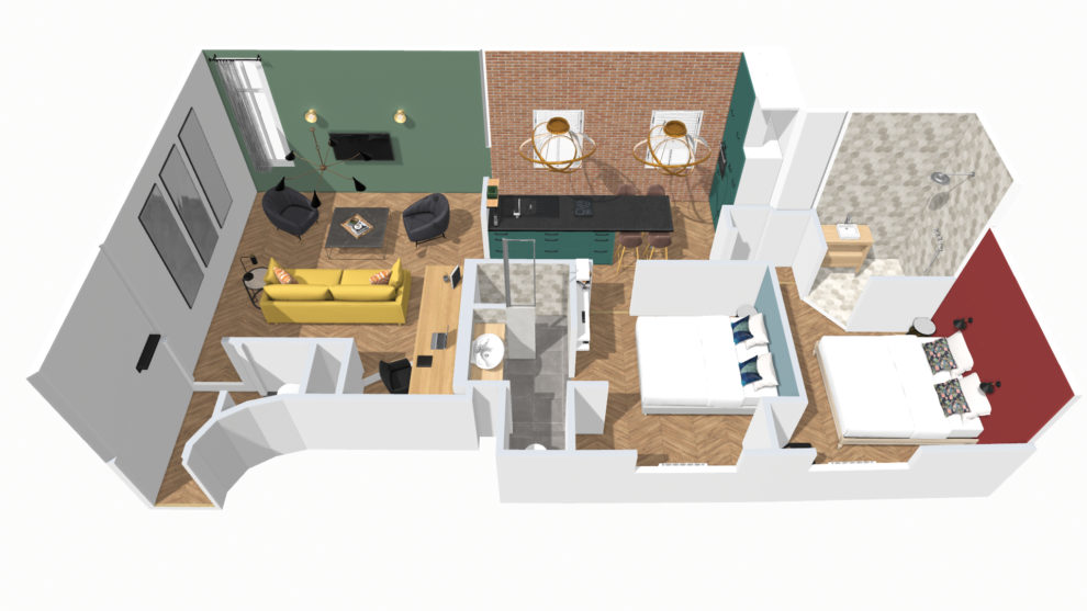 The apartment comprises three rooms: a fully renovated living room in a 16th-century building, with a 20th-century extension housing the open kitchen and bedrooms.