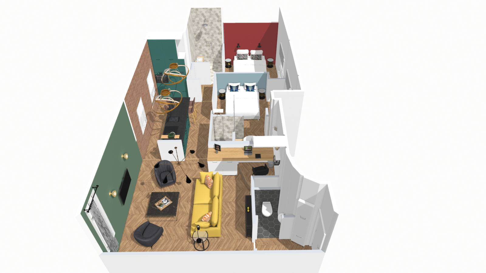 It features a comfortable sofa for three, two armchairs, a coffee table, a wall-mounted connected TV and a desk area.