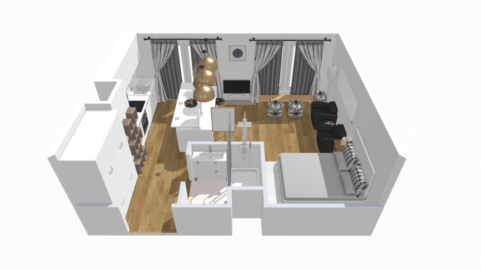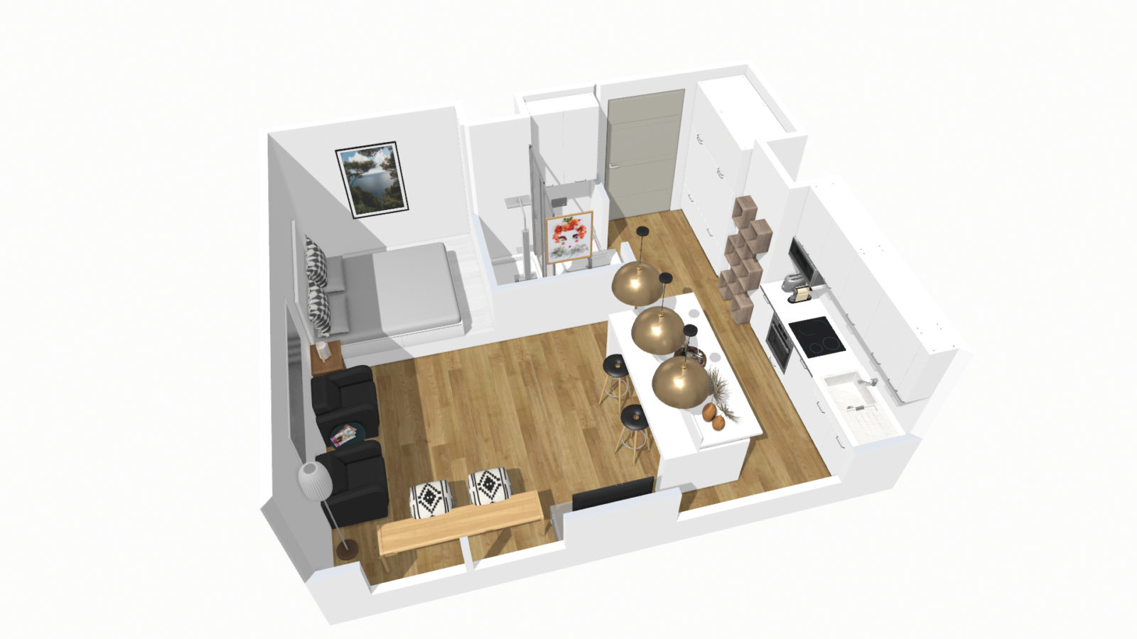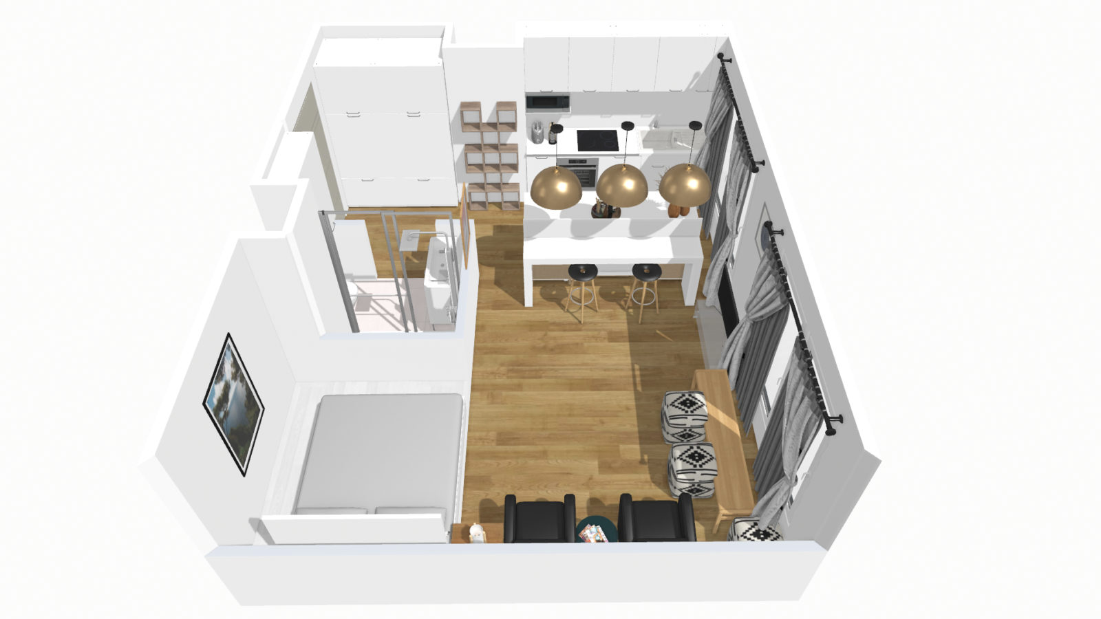 The central island and high stools can accommodate 2 people for cooking and meals.