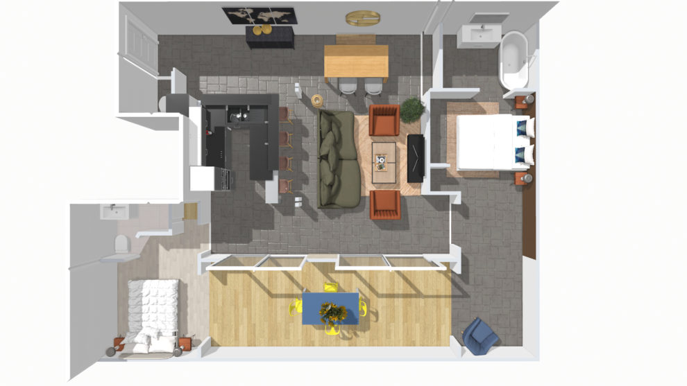 It comprises an entrance hall, a large open-plan kitchen, a living room with dining area, two bedrooms, each with its own bathroom, 2 toilets, and a private garden accessible via the living room and the second bedroom.