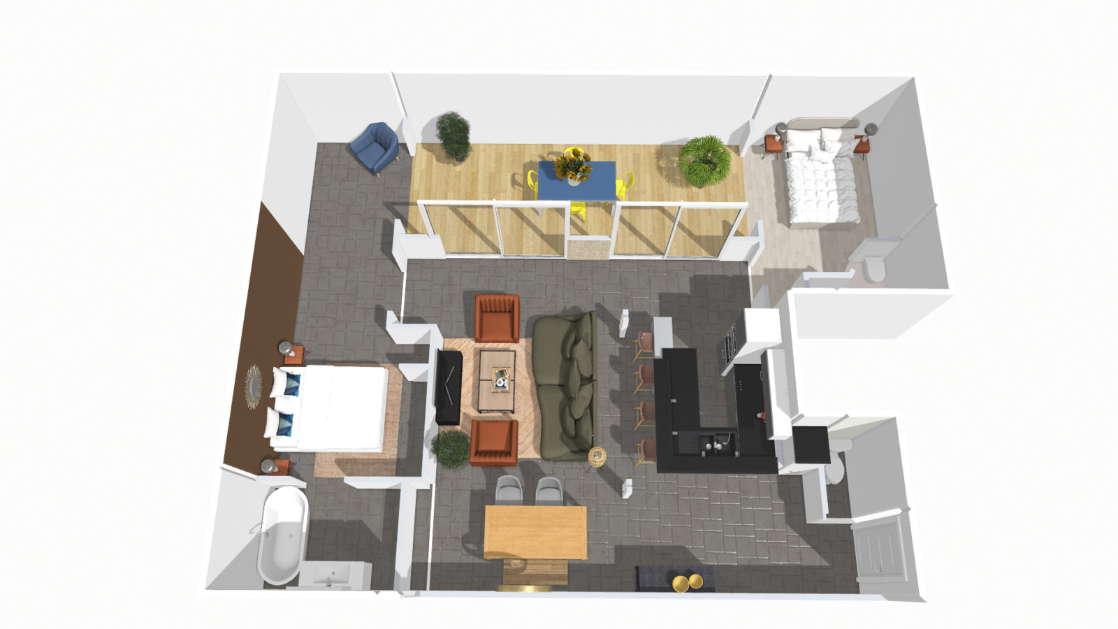 It comprises an entrance hall, a large open-plan kitchen, a living room with dining area, two bedrooms, each with its own bathroom, 2 toilets, and a private garden accessible via the living room and the second bedroom.