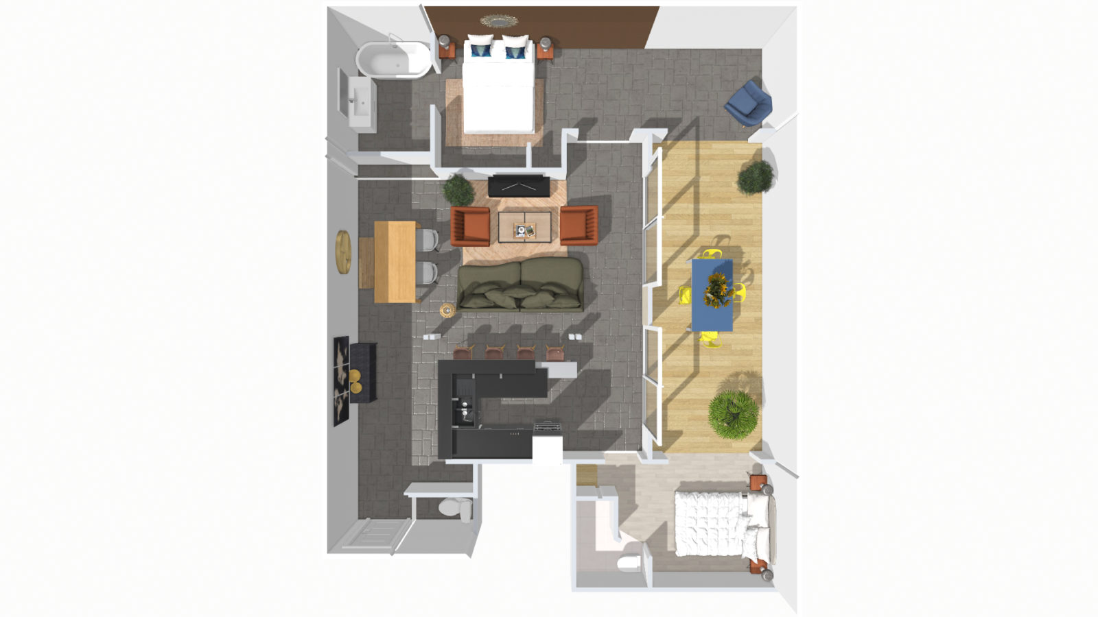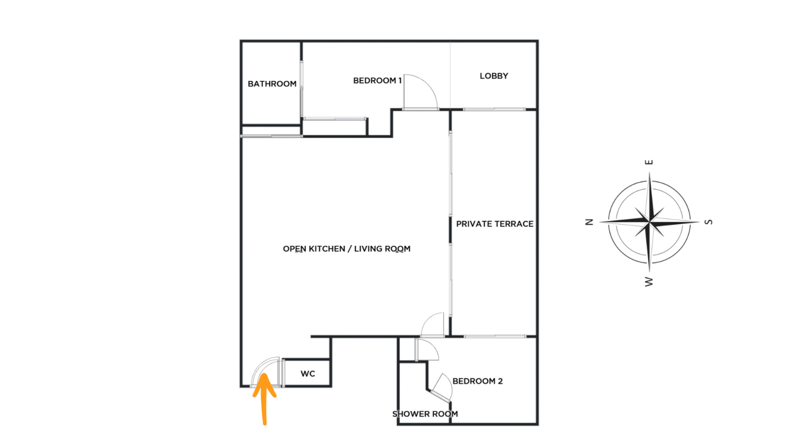 Located on the ground floor, it is accessible via an inner courtyard and has a private terrace.