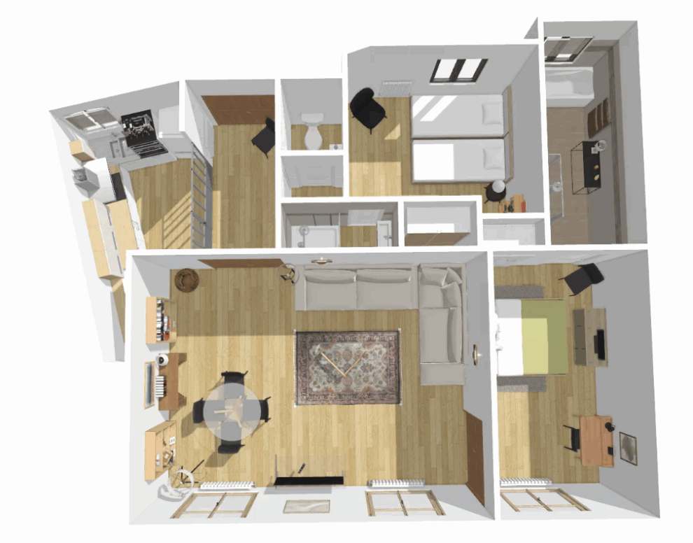 The apartment is new, recently renovated and is equipped with triple glazed windows for enhanced sound insulation.
