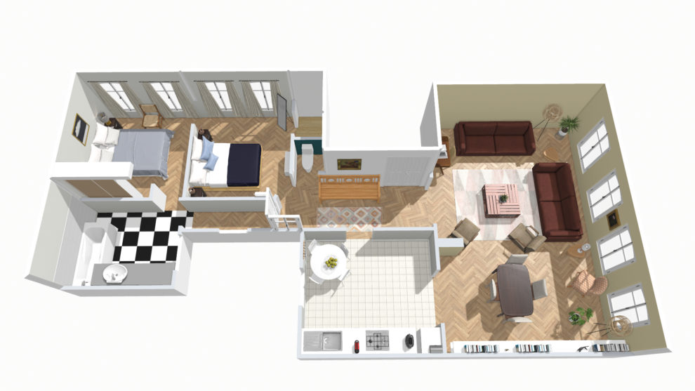 It comprises a kitchen and a double living room overlooking Rue Saint Placide, two bedrooms with 160x200cm and 140x190cm beds, a bathroom and a separated toilet.